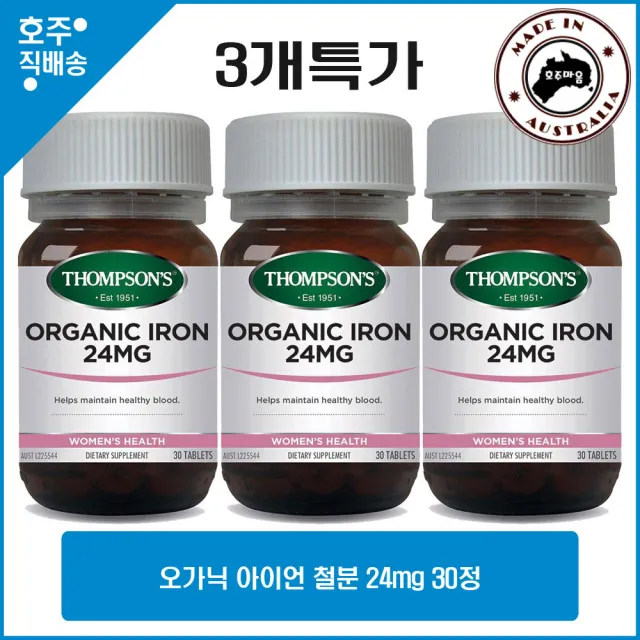 Thompson's Organic Iron 24mg 30 Tablets 3병특가, 1개 구매