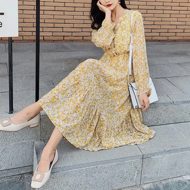 kirahosi 봄 여성 브이넥 쉬폰원피스 꽃무늬 미디 롱 원피스 + 덧신증정 CH4isr4l 구매