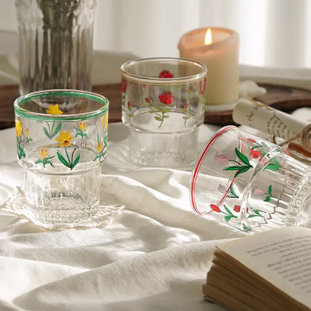 데코뷰 레트로 플라워 라인 유리컵 202ml x 3종, 장미, 수선화, 튤립, 1세트 구매