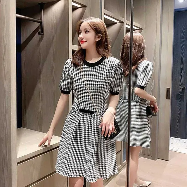 트위드패턴 퍼프소매 원피스 라운드넥퍼프소매원 여름여행지패션 여성오피스룩코디 구매