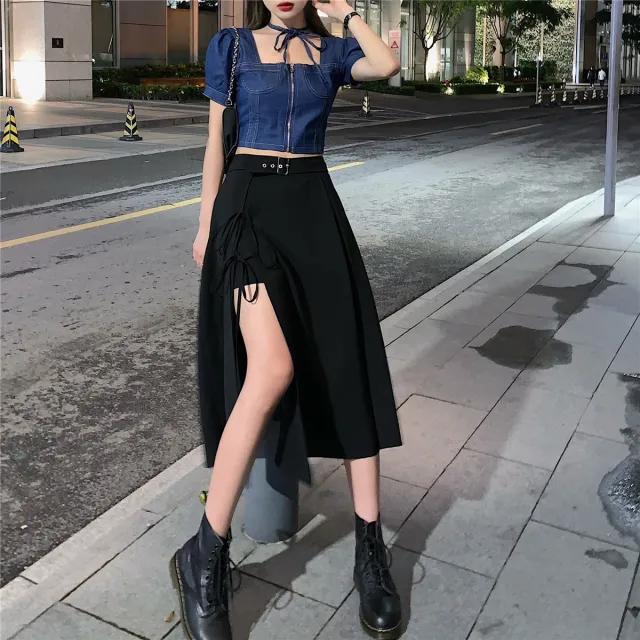DIPYLON 여성 캐주얼 세트 블랙 슬릿 스커트 여자 여름 중기장 하이웨스트 라인 언 구매