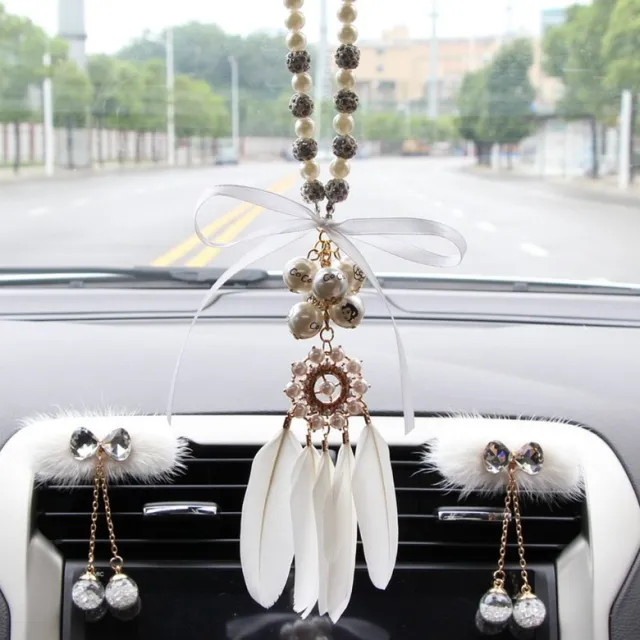 차량용 핸드메이드 행잉 마크라메 룸미러 깃털 장식품 무사고기원 백미러 차량용 인테리어 소품 연인 새차선물 자동차 차내부꾸미기, 진주체인 깃털(리본 2개 증정) 구매
