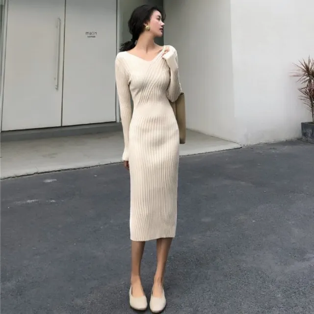 웨스턴 슬링 니트 드레스 브이넥 봄 롱 스커트 미디 원피스 구매